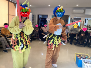 2026年3月1日 北40条館 節分&誕生会 2月25日のんびり屋の鬼がやっと北40条館へやってきました👹 豆まきの代わりに玉入れゲームで鬼退治!(^^)! 今月誕生日を迎えられたKさん92歳!おめでとうございます🎉 豪華なひな人形をディルームに飾りました🎎 < 前の記事へ 記事一覧へ >